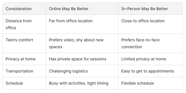 Research consistently supports online therapy as effective when the therapeutic relationship is strong. For many teens, starting online makes therapy feel more accessible and less intimidating before potentially transitioning to in-person sessions.